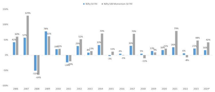 Source/Disclaimer: niftyindices. Performance as of close of 31-Dec-06 to 31-Jul-24. *2024 till year to date. Performance results have many inherent limitations and no representation is being made that any investor will, or is likely to achieve. Past performance may or may not be sustained in future and is not guarantee of any future returns. The above graph is used to explain the concept and is for illustration purpose only and should not used for development or implementation of an investment strategy.