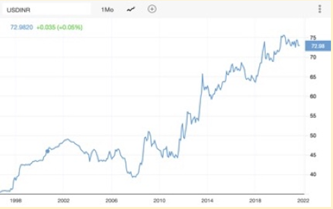In this chart, we can see the gradual depreciation of the rupee over a period of 20+ years, which is ranging from approximately Rs.40 in the year 2000 to