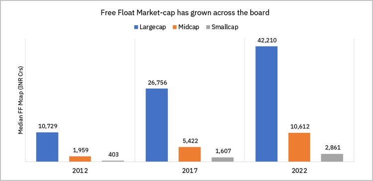 The Free float market-cap of a typical Largecap company has grown nearly 4x from over ₹10,500 Crs in 2012 to over ₹42,000 Crs in 2022. Similarly, the Free Float market-cap of a typical Midcap company has grown 5x, while it has grown nearly 7x for Smallcaps. Interestingly, the average Midcap stock now has the same market-cap of ~₹10,000 Crs as the typical Largecap stock 10 years ago!