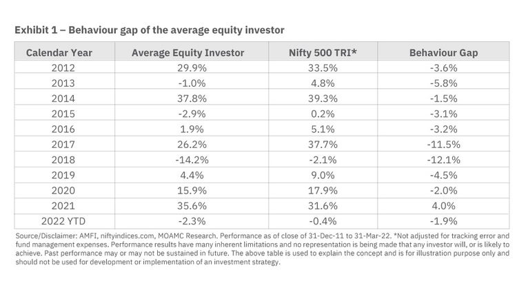 The behavior gap is typically caused by irrational investment decisions taken by investors that are often based on emotions. An example of this is making investment decisions based on recent performance. You would be familiar with the common “Past performance is no guarantee of future results” disclaimer If you have looked at any marketing material published by mutual fund houses in the last couple of decades. Yet, a very large chunk of investors continues to base their investment decisions of buying and selling on recent performance.