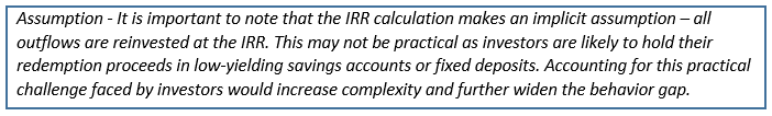 To understand how well the average equity investor performs (investor return) in comparison to the market (investment return), we analyzed the net fund flows into open-ended Equity schemesover the last 10 years. A simple IRR calculation of these net flows can help approximate returns experienced by the average equity investor. The difference between the returns generated by the average equity investor and the Nifty 500 TRI (proxy for equity market) is highlighted in the “Behavior Gap” column. A negative “Behavior Gap” implies that the average investor underperformed in that period while a positive reading implies outperformance.