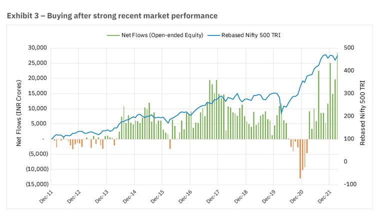 Another example of irrational investor behavior is believing that you can effectively and consistently time the market. When the market crashed in early 2020 due to the Covid-19 pandemic, there was a visible spike in the net inflows into equity schemes. The average investor had made hay of the opportunity and bought when the market was low. However, this was followed by 8 consecutive months of net outflows (of INR ~47k crores) from Jul-2020 to Feb-2021 as the markets continued to climb higher and higher. The average investor got cold feet and sold very early, having failed to foresee this tremendous bull run in the Indian equity markets.