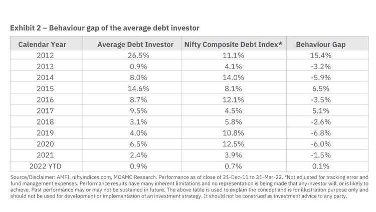 The same analysis conducted for the average debt investor yielded similar results with underperformance noted in 7 of the last 10 calendar years. Over the entire period, the behavior gap for the average debt investor was considerably smaller at just 0.4% per annum. The smaller underperformance may be partially attributed to a much larger share of institutional participation in the debt-oriented mutual fund categories who are likely to be less erratic in their investment decisions as compared to retail investors.
