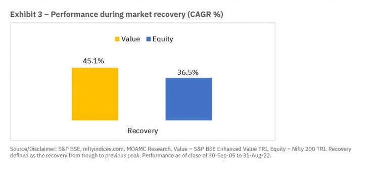 Historical data suggests that the Value Factor tends to outperform the broad-based equity when the market is staging a recovery after a crash. On an average, the market delivered 36.5% CAGR during recovery while the Value Factor delivered 45.1% CAGR – a staggering outperformance of ~8%!