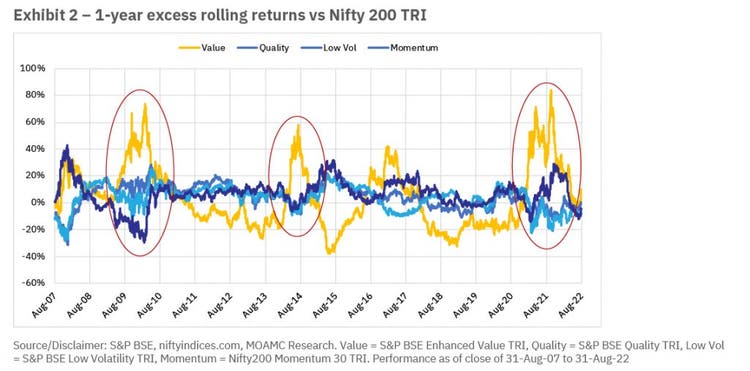 However, it is important to note that the Value Factor also significantly underperforms during market crashes to the tune of ~8% CAGR. This means that Value is highly sensitive to economic cycles and tends to amplify the positive as well as negative movements of the market. Therefore, Value is considered a “pro-cyclical” Factor.