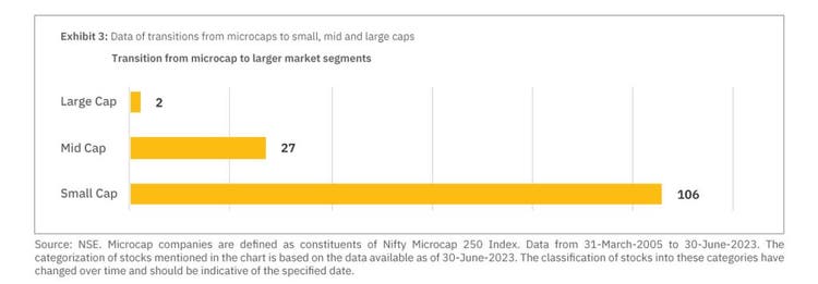 The data presented in exhibit 3 showcases the impressive transformations that microcap companies have achieved. However, investing in microcaps comes with inherent risks, as while some companies may successfully transition to larger market caps, others may face challenges and potential downward trends in market capitalization.