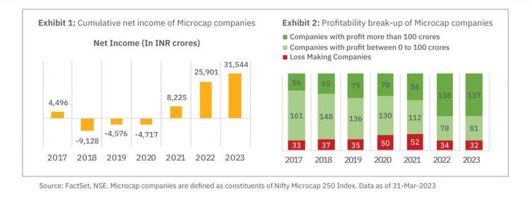 But that’s not all. Let’s focus on the bigger picture by examining the subset of microcap companies with substantial profitability. In 2017, an impressive 56 companies generated profits exceeding ₹100 crores. In 2023, that number has soared to around 137 companies. This substantial increase demonstrates that a growing number of microcap companies are profitable and are scaling their earnings to surpass the ₹100 crores mark.