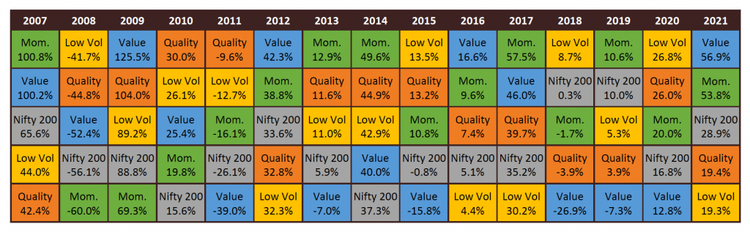 Factors have risks and ignoring these risks can leave investors underprepared as far as their investments are concerned. Investors, for e.g., can form exaggerated expectations about performance of a particular factor as a result of past returns and hence can ignore the fact that factor returns tend to be cyclical. They tend to perform differently in various economic and market regimes. As can be seen in the quilt below, each of the factors underperform the broader market over a certain period of time. This can lead to poor allocation choices with regards to entering / exiting a particular factor in the short term as it is prone to timing risk.