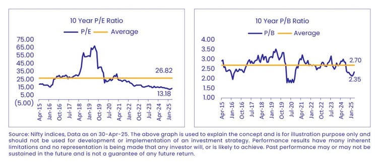 - On the P/B (Price-to-Book) front, the sector’s 10-year average is 2.70x, while current valuations are at 2.35x.