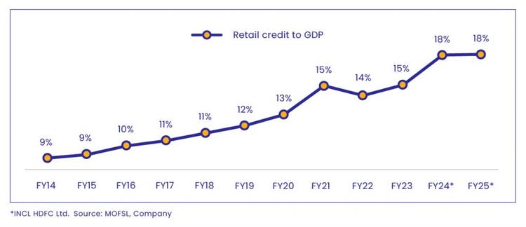 In 2014, retail credit was just 9% of GDP. A decade later, in FY25, it had doubled to 18%. The average Indian — salaried, smartphone-holding, and credit—hungry—became the new face of banking.