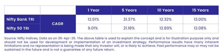 Over the last year, even in a macro environment shaped by rising rates and global uncertainties, Nifty Bank TRI outpaced the broader Nifty 50 by over 350 basis points. But it’s the long-term numbers that really make a case.