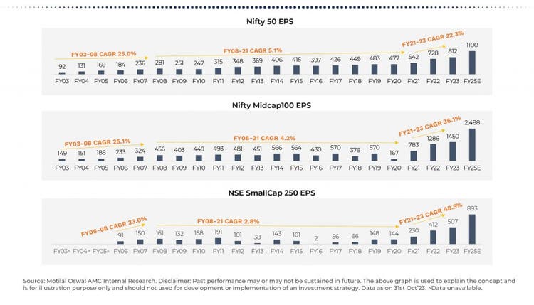 - Where is earnings growth higher: Higher growth in new emerging spaces with tailwind of reforms vs larger older businesses. This is a sharp change from what was witnessed in the 2008-2021 period. If we look at sharpness of earnings increase and spread of earnings, it feels more like 2003-2007 period vs 2008 to 2021 period. With most of the new themes in the small and midcap part of the market, this space should continue to deliver outperformance.