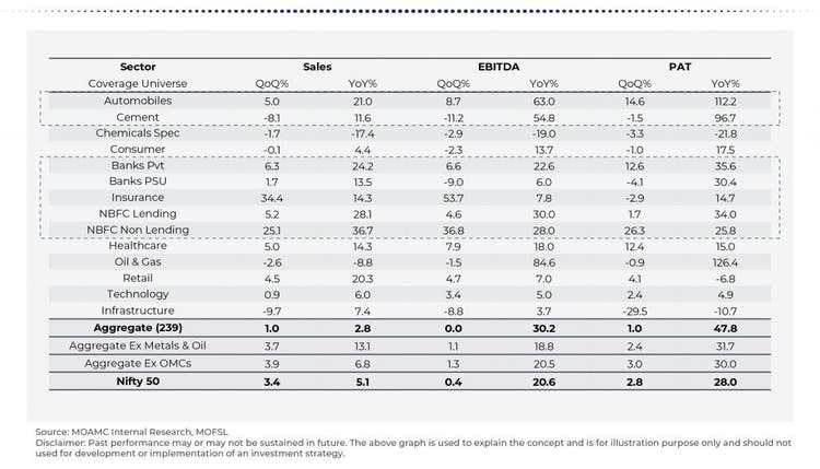 - Nifty delivered a beat with a 28% YoY PAT growth (vs. est. of +21%). Ex-OMCs, Nifty’s earnings grew 22% YoY (Vs. est. of +15%). Ex-Metals & O&G, Nifty earnings were up 32% (Vs. est. of +27%).