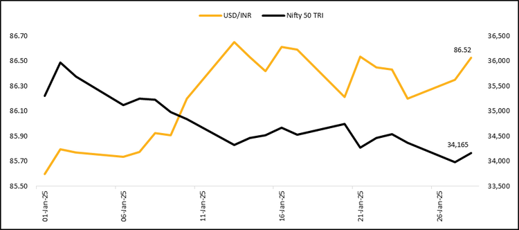 CY25 has started with a sharp correction. Bond yields in the US sharply climbed to over 4.8%. FPIs have been strong sellers in Jan after being marginal buyers in Dec. However, as against large caps falling relatively more in a period of strong FPI selling, a variation in this period of correction has been a sharp drop seen in the midcap and small cap part of the market. The correction could have been on profit taking after a strong rally, FPI selling on bond yield increase and INR depreciation, end of year considerations of retail and HNI investors and margin call based selling on price drops. India has been amongst the weaker markets globally in this period.