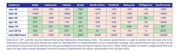 While over last two years, FPIs have been marginal sellers, over the past 4 months, they have been net buyers. In such periods, markets have historically seen a bounce because domestics are secular buyers and the same has been observed from March. Brazil, the only emerging market to see inflows in the January – February period, continued to witness inflows. Domestic flows have been slowing down in the new year but we sense that the month of June has seen a revival.