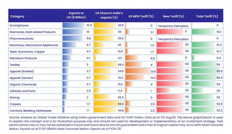 US has put a 25+25% tariff on India. Ex of pharma, electronics which are excluded, other exports from India in spaces like textiles, leather and shrimps are de-facto denied entry. In spaces like steel, aluminium and copper, the duties are at 50% across the world and companies are at par. At current juncture, the impact on market is limited as spaces, which are impacted, have only got a marginal presence in the market. In any case, if we believe that the global demand and supply can’t be changed very quickly, then in most cases, we expect shifts in target market vs permanent damage, especially if the issues can be resolved in due course.