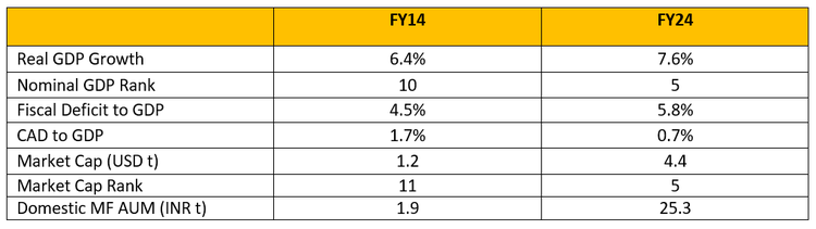 India is set to exit FY24 with a GDP of USD3.6t and an underlying growth of 7.6%+. Capital markets signed off FY24 with a stellar 29%/60%/70 % returns in Nifty/Nifty Midcap 100/Nifty Smallcap 100. India’s market cap has reached USD4.4t, making it the 5th largest in the world. Over last 10 years, our GDP rank has changed from 10th to 5th, current account deficit has reduced from 1.7% to 0.7% and forex reserves have expanded.