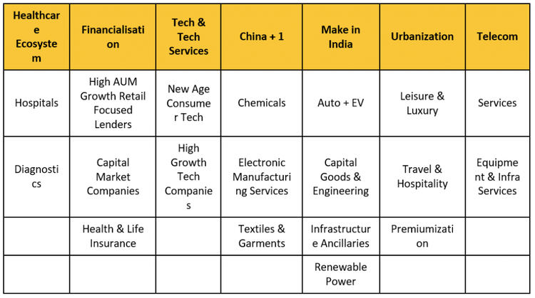 Amongst the themes which are present in our various portfolios, we expect defence to find new focus on account of geopolitical situation. Chemical sector has not performed over past one year and there is now hope that the inventory de-stocking cycle is now behind us which is improving sentiment here. Themes like luxury consumption and capex should hold out during the election season quite well and good monsoons (expected on La Nina) should help. EMS space should benefit from new PLI rollouts once the new government formation has taken place. Renewable space is seeing strong corporate sector ordering which is keeping the order books buoyant. We are less present in the IT sector where results have been weak.