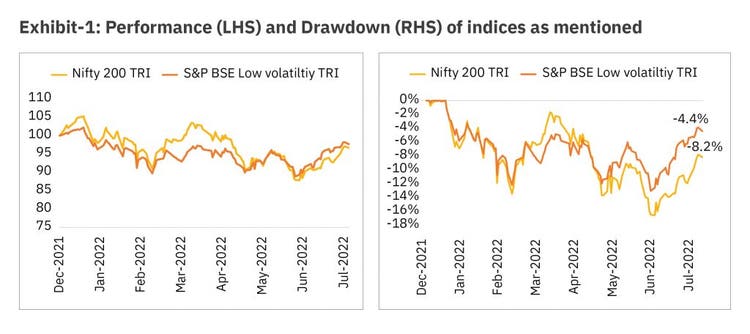 Source: MOAMC, niftyindices.com, S&P BSE; Data as of 25 July 2022; Markets – Nifty 200 TRI, Low volatility – S&P BSE Low Volatility TRI The above table explains the concept, is for illustration purposes only, and should not be used to develop or implement an investment strategy. Note that the assumptions listed above are central to the illustration.