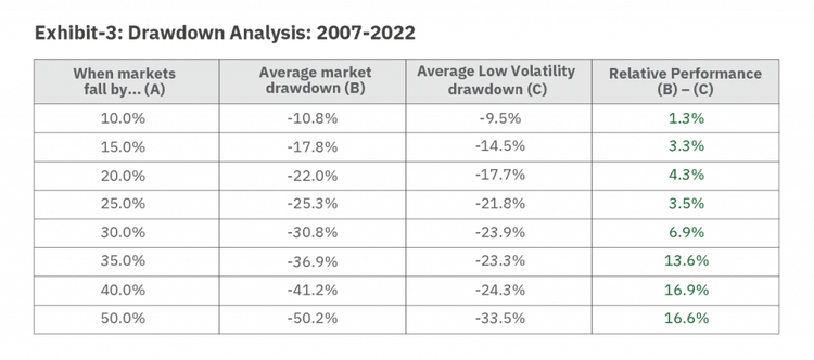 In the table above, Column (B) shows the average drawdown of markets each time it fell by X%, i.e. mentioned in column (A). Similarly, column (C) shows the average drawdown of the low volatility strategy during the same period.