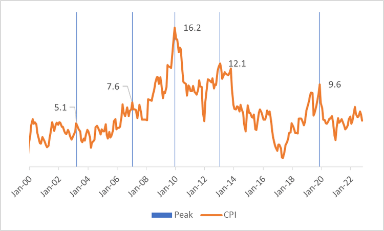 Exhibit 1: Historical (CPI) Inflation Peaks in India