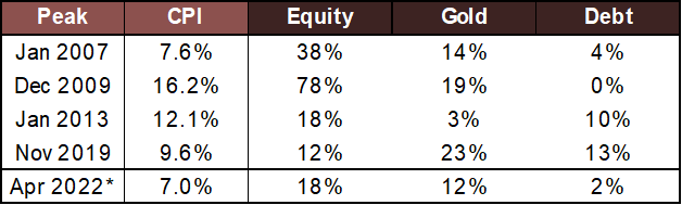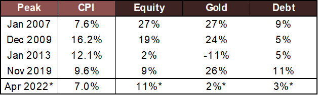 Since it is difficult to identify when inflation will peak in real-time, the effects of inflation generally come with a lag. High inflation causes a rise in raw material costs that impact company earnings & eventually, equity returns. Thus, equity returns have been relatively low post-peak inflation. Even gold rises higher due to its perception of an inflation hedge (except in 2013 on account of USD appreciation). Similarly, delayed central bank response to high inflation by way of rate hikes causes debt to do only slightly better than before Inflation peaks.