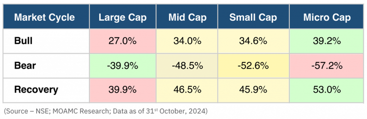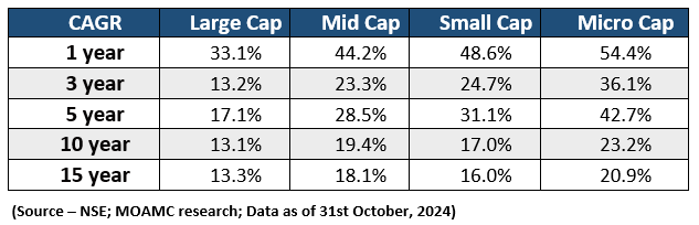 Note: Largecap = Nifty 100 TRI; Midcap = Nifty Midcap 150 TRI; Smallcap = Nifty Smallcap 250 TRI; Microcap = Nifty Microcap 250 TRI