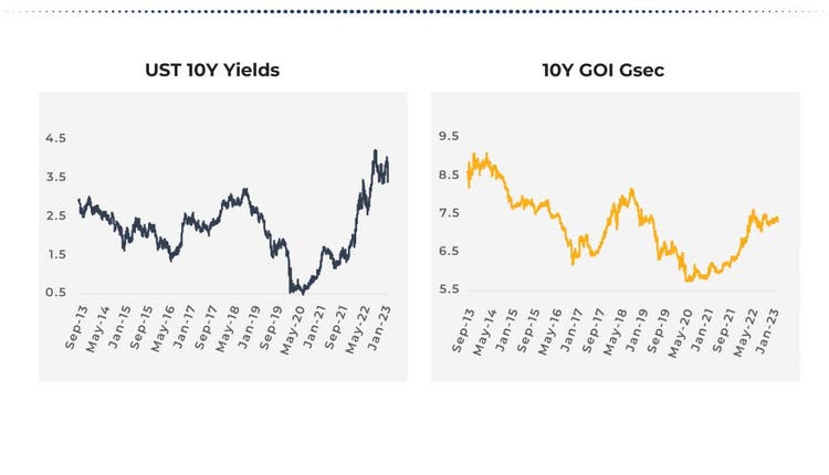 March’23 witnessed heightened volatility as global markets had to digest stress from several banks. Silicon Valley Bank equity plummeted to zero with marked to market losses. Similarly, some other US banks suffered impact on their net worth on account of mark to market losses on government papers. We examined this in the Indian context and think that this issue should not crop up in India. Our 10-year bond yields were lower than current yield levels for a period of only around one year. In comparison, the current US yields are the highest over last 10 years, implying mark to market losses on bulk of government securities.