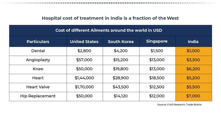 Also, increasingly hospital services similar to western standards are increasingly coming up in the corporate sector. Interestingly, the cost of treatment in India is a fraction of the west, as the table, which is indicative, below shows. This has opened up an interesting opportunity for the segment. Not only would it cater to the growing population of seniors in the country, but could also become a destination for medical tourism.