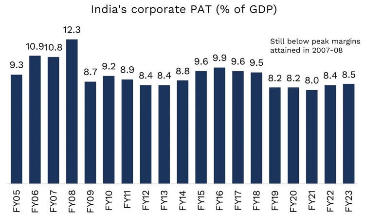 Margins could expand as Inflation has fallen. 2023 has been the story of better margins and this could continue into 2024 as we are still below peak margins attained in 2007 (profit as a percentage of GDP) while policy direction is much more conducive.