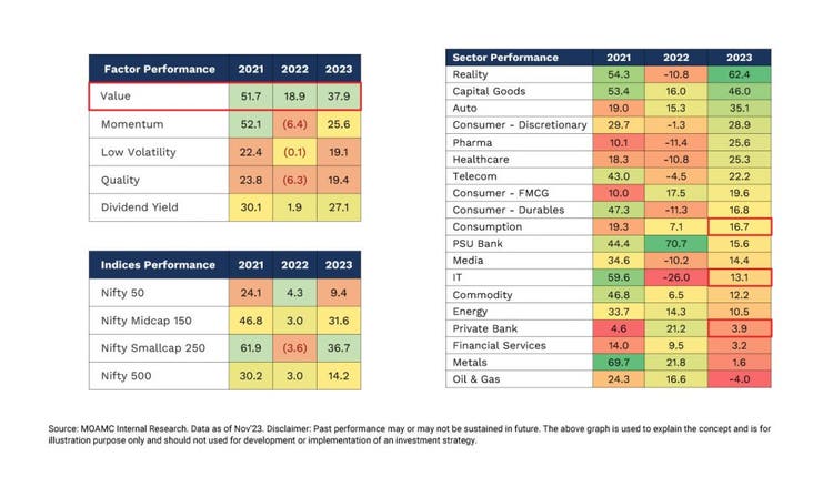 Calendar 2023 continued to be the year of value style of investing. This has been the case for the last 3 years when the beaten down spaces have come back strongly on sustained government support. If we look at some of the strongest performers of 2023, they belonged to the PSU space in sectors like power ecosystem which includes producers like NTPC and Neyvelli Lignite, financiers like PFC and REC and new listing like IREDA and equipment makers like BHEL and commodity input producers like Coal India. Metal ecosystem also did well with both PSU and private companies doing well. PSUs in defence space saw a strong momentum across the board. Many of these spaces still retain value and are benefitted positively by the reform agenda and still offer value. Some, like BHEL, are re-inventing themselves. These spaces could hence continue to do well this year.