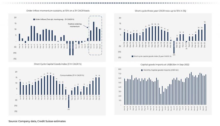 As compared to the past, when consumption was the sole driver of growth, capex is now gradually becoming the new growth driver. Data set around order inflows, short-cycle revenues of machinery and consumables, and capital goods imports together paint a picture that investment cycle is building at a faster pace. Investment cycle seems to have skirted the pitfall of macro headwinds and commodity price volatility resulting from the Russia-Ukraine war.