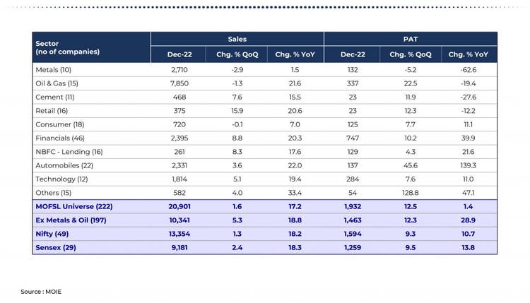 - Excluding metals and oil & gas, Nifty and the coverage universe delivered a solid 29% and 31% earnings growth respectively.
