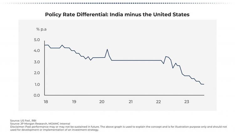 Last year in 2022, emerging markets were subject to another bout of pressure when the Fed started hiking in 75-bps increments, which sucked capital away from the “periphery” to the “centre”, and caused the U.S. dollar to surge. Simultaneously, the Russia-Ukraine conflict caused oil prices to spike. For a capital and commodity importer such as India, a stronger dollar alongside higher crude prices – a phenomenon observed again in recent weeks – was a double-whammy, pressuring both the current and capital account simultaneously. While the external sector was under sustained pressure for much of 2022, it did not show up in outsized Rupee depreciation vis-à-vis other emerging markets. In fact, the Rupee depreciated among the least compared to its peers when the pressure was on because the RBI aggressively intervened and sold dollars – to the tune of almost ~90 billion across spot and forwards – between June and October last year. Nothing cracked in India. No extraordinary interest rate defence was necessary. In fact, the interest rate differential between India and the United States progressively narrowed over 2022 and the Fed upped the ante. No external capital had to be mobilized and no special measures had to be invoked in India.