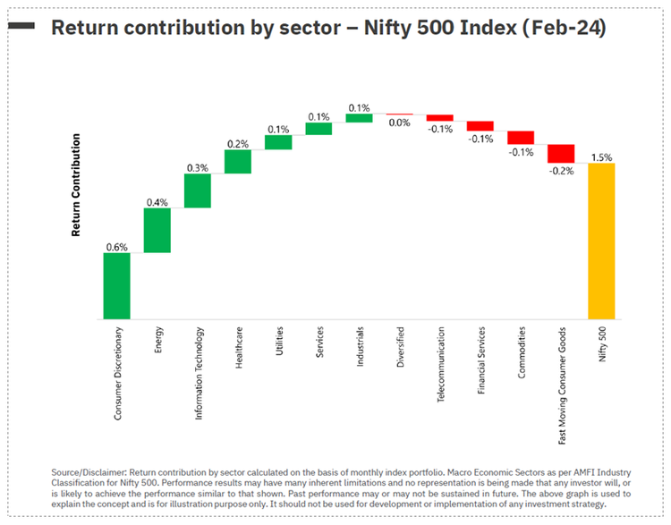The Consumer Discretionary, Energy and IT sectors were the top three contributors to the overall returns of Nifty 500, resulting in a positive impact of 1.3%.