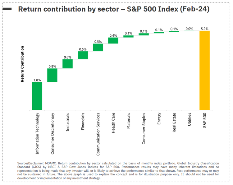 - In the US, S&P 500 and NASDAQ 100 both experienced a 5.2% and 5.3% gains respectively in February 2024 with the Information Technology sector once again being the largest contributor to the S&P 500’s rise.