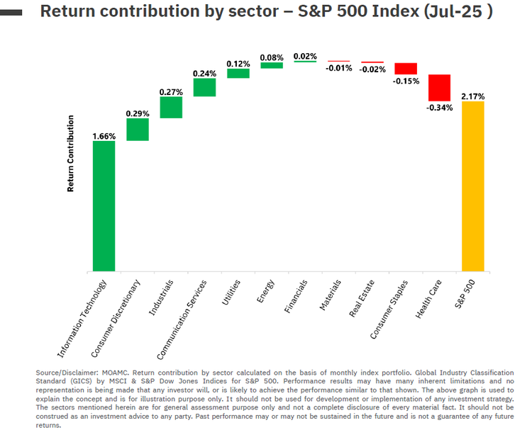 - S&P 500 gained 2.17% in July, with IT sector contributing to more than 75% of the overall index’s return.