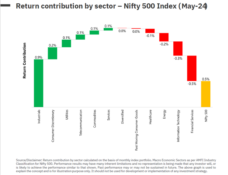 - The Industrials, Consumer Discretionary, and Utilities sectors were the top three contributors, collectively resulting in a positive impact of 1.2% to Nifty 500. Financial Services sector, previously the highest contributor, dragged returns down by 0.5%.
