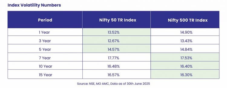 In shorter time periods, the volatility or standard deviation of the Nifty 500 has been higher than that of the Nifty 50. For instance, over the last one year, the Nifty 500 had a volatility of around 14.9