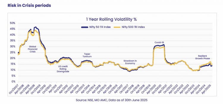 Historically, the Nifty 50 has shown higher volatility during extreme crises. For instance, during the Global Financial Crisis, its volatility peaked at around 46%, well above that of the Nifty 500. Similar patterns were seen during the US credit rating downgrade in 2011, the Taper Tantrum in 2013, and the Covid-19 outbreak in 2020. In each case, the Nifty 50 experienced more pronounced and prolonged spikes in volatility.