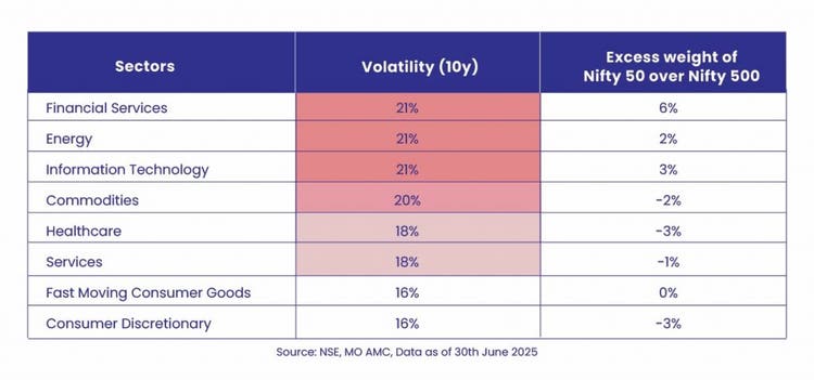 On the other hand, the Nifty 50 is underweight in Healthcare, Services, and Consumer Discretionary, all of which have shown relatively lower volatility, ranging between 16 and 18 percent. These sectors are more demand-stable, less exposed to global shocks, and tend to behave more predictably over long periods.