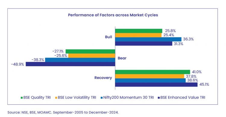 The Momentum factor has historically outperformed during bull markets, aligning with its reputation for performing well in rising markets. Conversely, the Value factor demonstrated its strength during the recovery phase, outshining every other factor and proving its resilience when valuations are bruised. However, the sharp negative returns experienced during bear markets nearly erode the wealth created by these factors in the bull and recovery phases, highlighting their cyclical vulnerability.