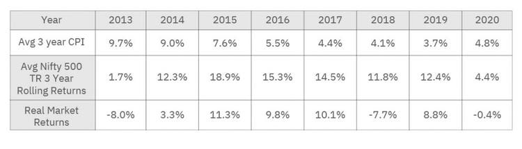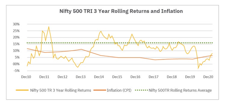 Source: NSE, GOI, WB, Data as of 30 December 2010 – 30 December 2020. Avg 3 Year CPI for 2013 is calculated by taking an average CPI (Annual %) of 2010-2013 and similarly for other years. All performance data in INR. Hypothetical performance results may have many inherent limitations, and no representation is being made that any investor will or is likely to achieve the performance similar to that shown. The above graph/table is used to explain the concept and is for illustration purposes only. It should not be used for the development or implementation of any investment strategy. Past performance may or may not be sustained in future.