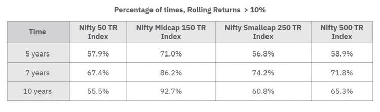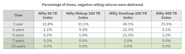 As seen from the table, the investments made in equity for more than five years had negligible negative returns (rolled daily). However, it means investing in equity for the short term can be a risky bet, and odds might not be in your favor. This leads us to a conclusion – A longer time frame safeguards us from the risk of negative returns.