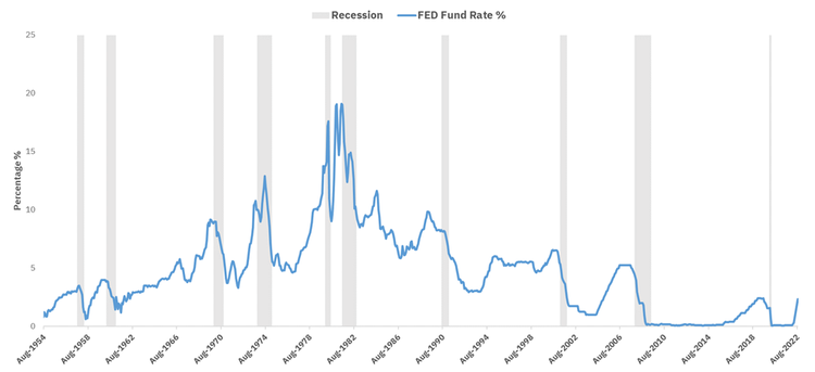 In the past 67 years whenever the FED has embarked on an interest rate tightening cycle, the US economy has fallen into a recession, as evident in the accompanying chart.