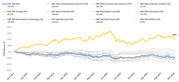 On the 22nd September the FED announced a rate hike of 75bps, the third straight three-quarter point increase and pushed Fed fund rate to 3.25%, highest since 2008. This sent the market tumbling: the bellwether index the S&P 500 fell -1.7%, taking it down by -21% Year to date basis.