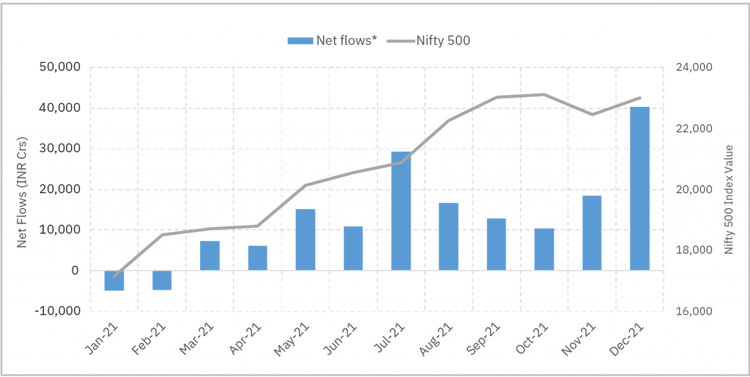 Source: MOAMC Research, AceMF, niftyindices; Data as of 31-Dec-2020 to 31-Dec-2021; *Net flows estimated using NAV-adjusted AUM and include both SIP and Lumpsum flows.