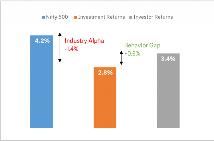 The Nifty 500 delivered 4.2% returns in 2022 despite heightened volatility due to geopolitical turmoil, persistent inflation, and rate hikes. The asset-weighted return of all equity mutual funds (including Index Funds and ETFs) came in at 2.8% and is dubbed as investment returns. This underperformance of 1.4% against the benchmark can be interpreted as the negative alpha delivered by all equity funds post management fees. However, the actual returns realized by investors turned out to be slightly higher at 3.4%, implying a positive behavior gap of 0.6%!