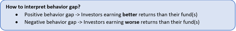 The difference between the returns actually realized by investors (investor returns) and what their investments could have earned (investment returns) is called the behavior gap. Typically, the behavior gap is negative as behavioral biases such as chasing returns and panic-selling result in investors buying and selling at the wrong times. Therefore, it is important to understand and manage the behavior gap as it can have significant impact on an investor’s long-term returns.