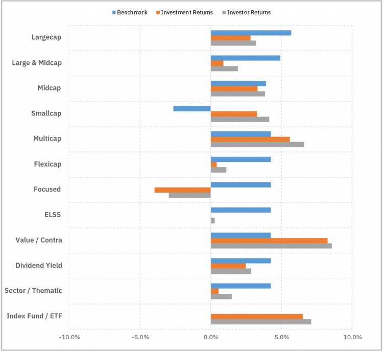 • Index Funds / ETFs category registered a positive behavior gap of 0.6%. The benchmark return for this category is not shown as Index Funds and ETFs typically perform very similar to the index that they are tracking.